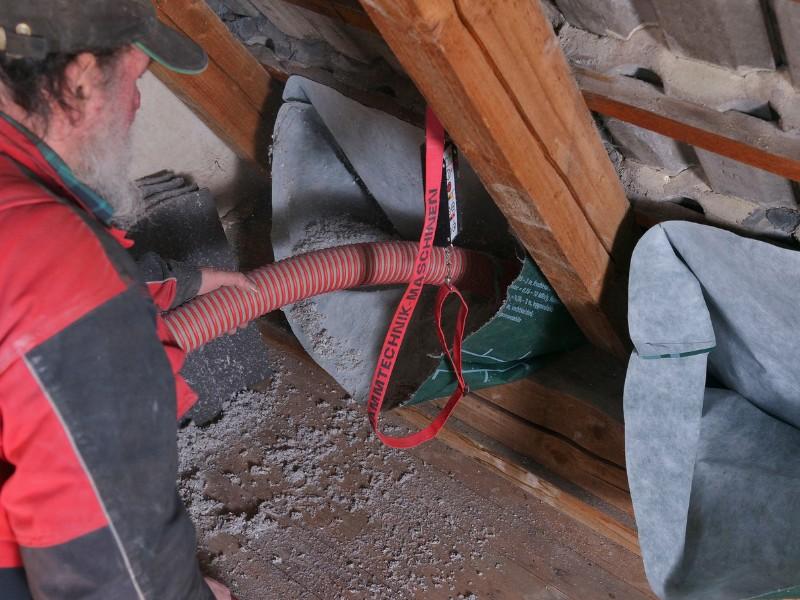 Vom Spitzboden aus wird der Dämmsack eingeführt