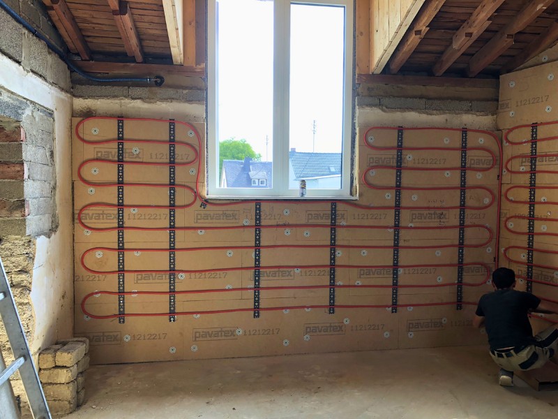 Wenn Sie Ihre Wand mit Lehm verputzen, dann überlegen Sie sich, ob Sie nicht gleich auch eine Wandheizung einbauen wollen. Die Vorarbeiten sind schon vorhanden und die Installation wird dadurch günstiger. Sie befestigen die Heizungsrohre an den Holzweichfaserplatten und tragen den Lehmputz etwas dicker auf. Der Lehm sorgt dafür, dass sich die Wärme schnell und gleichmäßig verteilt.